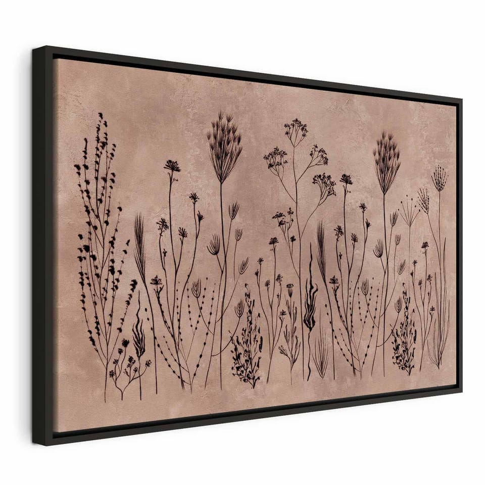 Obraz - Polne kwiaty - czarne rośliny na tle w technice lime wash rozmiar 90x60, wykończenie W ramie drewnianej czarnej