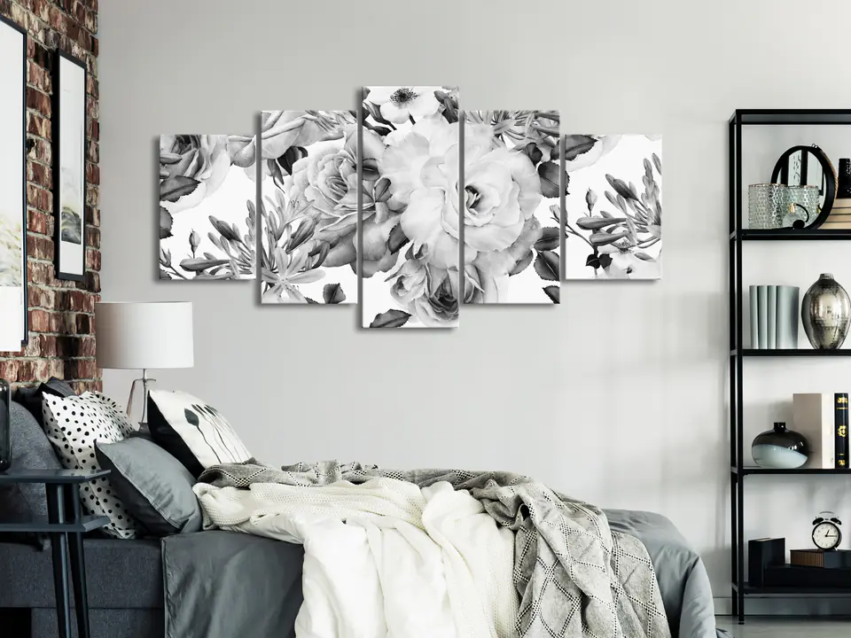 Obraz - Różana kompozycja (5-częściowy) szeroki czarno-biały rozmiar 225x112.5, wykończenie Premium Print
