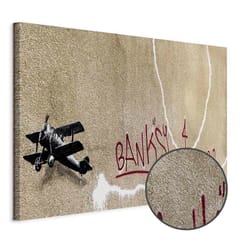 Obraz - Samolot Banksy (1-częściowy) - graffiti czerwone napisy na tle muralu rozmiar 120x80, wykończenie Premium Print