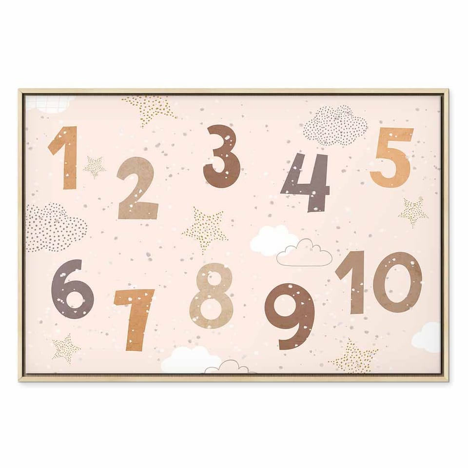 Obraz - Skaczące cyferki - Cyferki w przygaszonej beżowo-brązowej kolorystyce pośród płatków śniegu gwiazd i chmur rozmiar 120x80, wykończenie W ramie drewnianej naturalnej