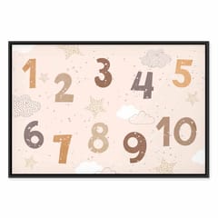 Obraz - Skaczące cyferki - Cyferki w przygaszonej beżowo-brązowej kolorystyce pośród płatków śniegu gwiazd i chmur rozmiar 60x40, wykończenie W ramie drewnianej czarnej