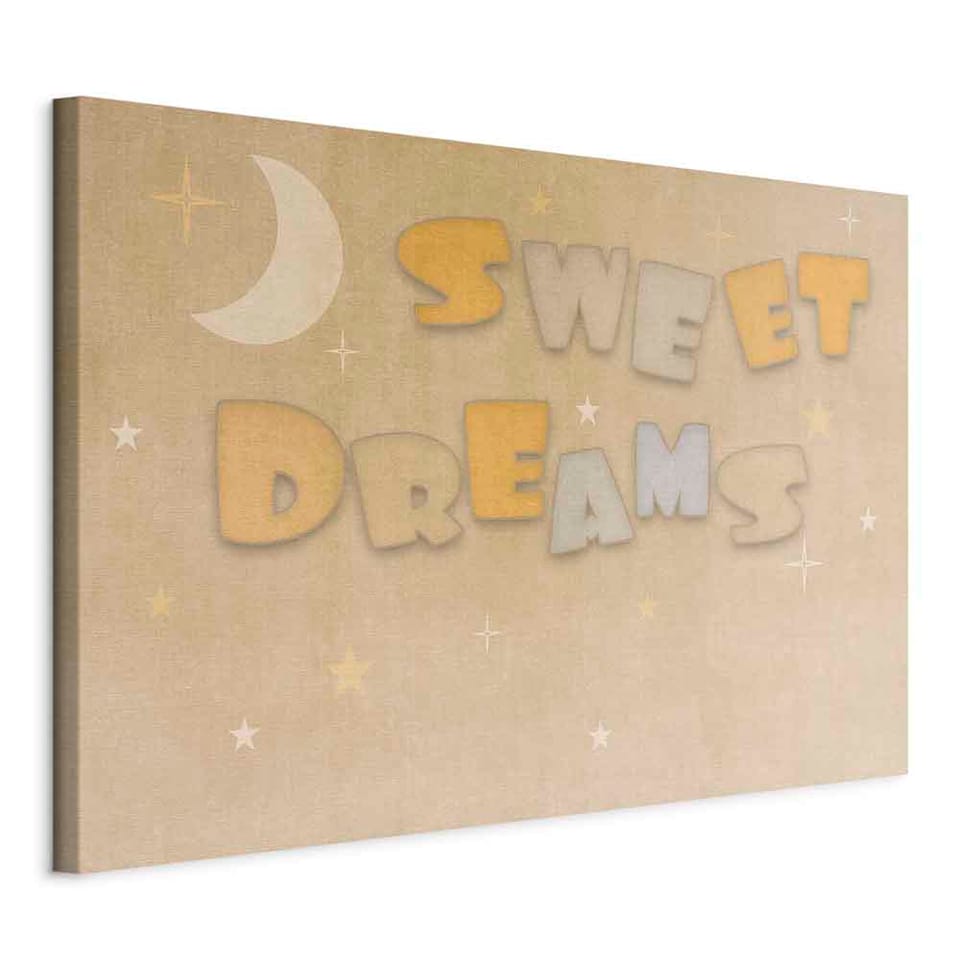 Obraz - Słodkich snów - pastelowy napis w otoczeniu księżyca i gwiazd rozmiar 90x60, wykończenie Na płótnie włoskim