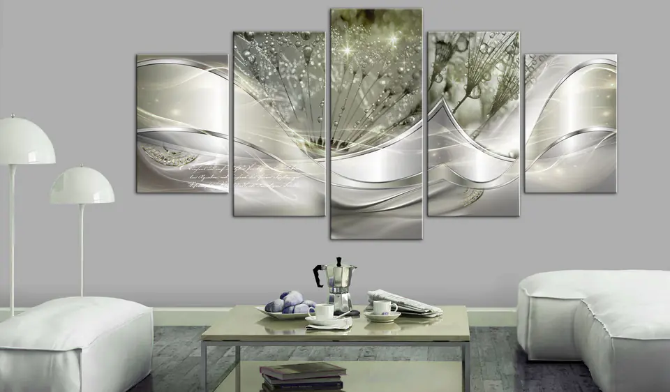 Obraz - Świecące dmuchawce (5-częściowy) zielony szeroki rozmiar 225x112.5, wykończenie Na płótnie włoskim