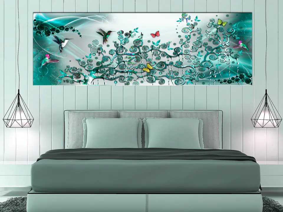 Obraz - Taniec kolibrów (1-częściowy) turkusowy wąski rozmiar 150x50, wykończenie Premium Print