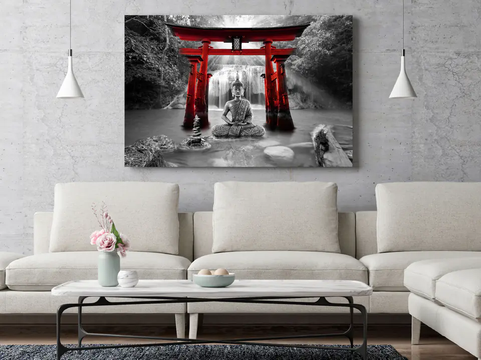 Obraz - Uśmiech Buddy (1-częściowy) szeroki czerwony rozmiar 30x20, wykończenie Premium Print