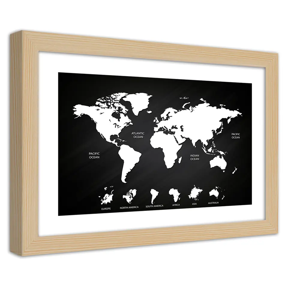 Obraz w ramie, Kontrastowa mapa świata i kontynenty (Rozmiar 90x60)