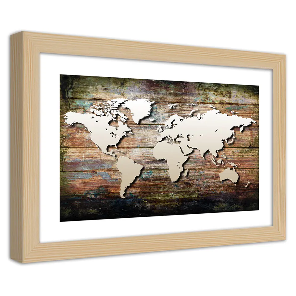 Obraz w ramie, Mapa świata na starych deskach Rozmiar 45x30
