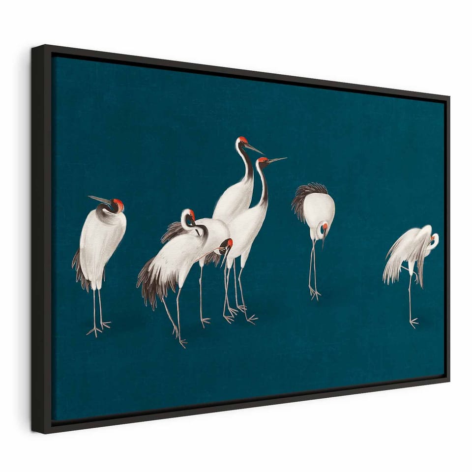 Obraz - Wieczór nad stawem - grupa żurawi narysowana suchą pastelą, na ciemno-turkusowym tle rozmiar 60x40, wykończenie W ramie drewnianej czarnej