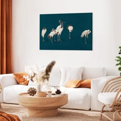 Obraz - Wieczór nad stawem - grupa żurawi narysowana suchą pastelą, na ciemno-turkusowym tle rozmiar 90x60, wykończenie Premium Print