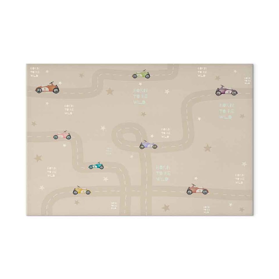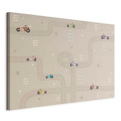 Obraz - Wyścig - kolorowe autka na drodze na beżowym tle z napisami rozmiar 60x40, wykończenie Na płótnie włoskim