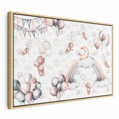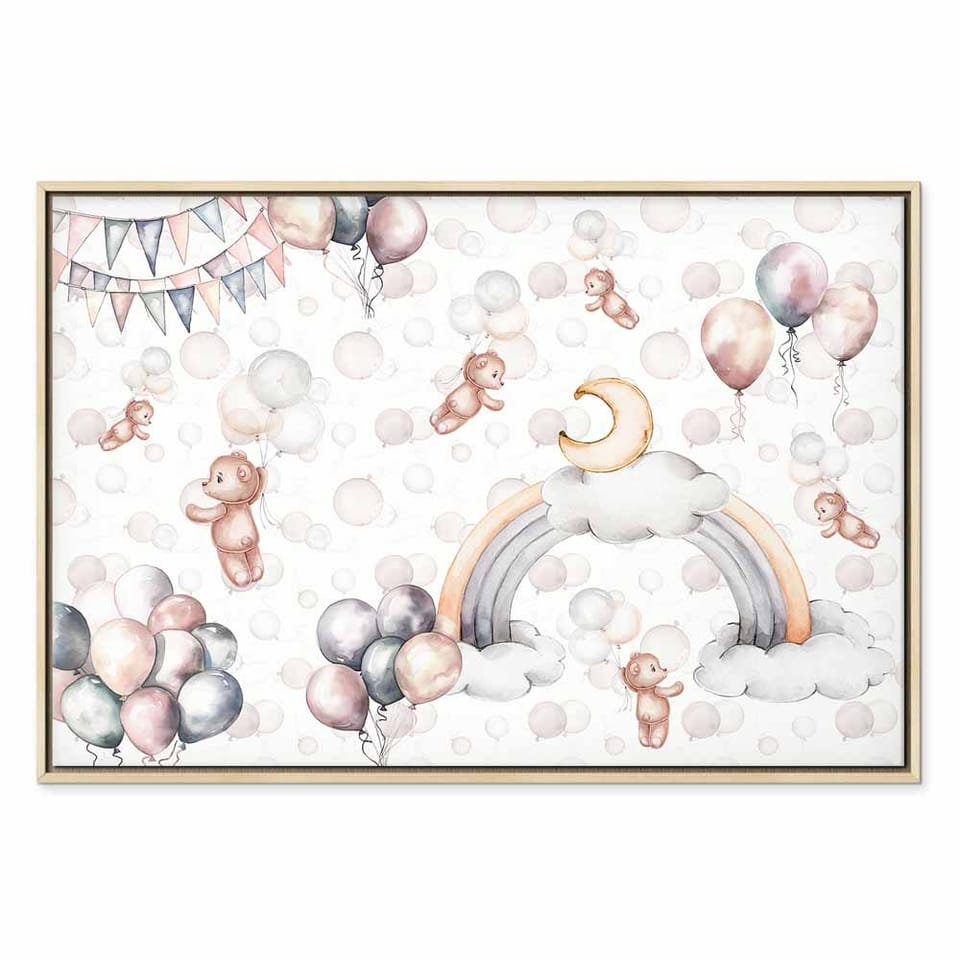 Obraz - Zabawkowe misie z balonikami - Latające pluszowe misie pośród balonów chmur i tęczy w subtelnej pastelowej kolorystyce rozmiar 120x80, wykończenie W ramie drewnianej naturalnej