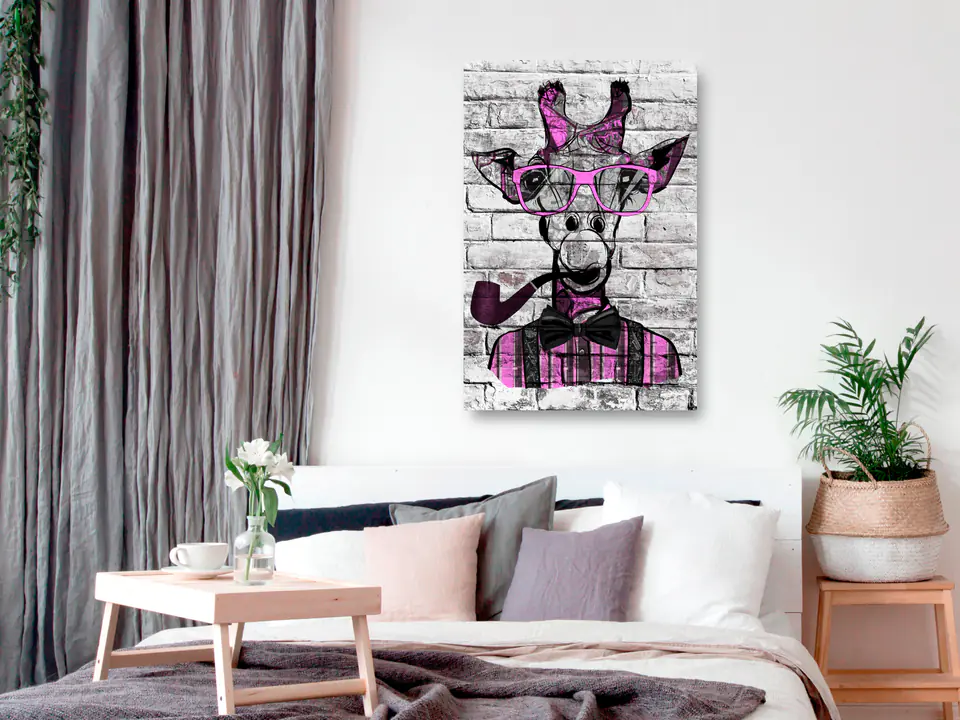 Obraz - Żyrafa z fajką (1-częściowy) pionowy różowy rozmiar 40x60, wykończenie Na płótnie włoskim