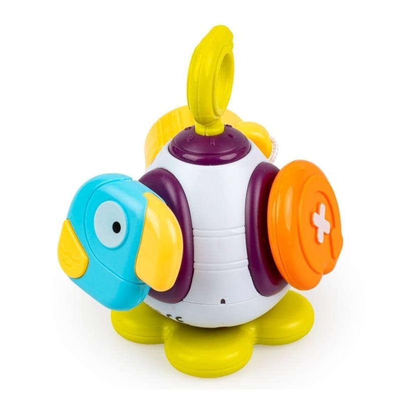 Obrotowa Piramidka Praktyczna zabawka w kompaktowym rozmiarze zapewni maluchowi zręcznościową rozrywkę, niezależnie od miejsca, w którym się znajduje. Na każdej ze ścianek piramidki kryje się inne zadanie do wykonania: obrotowy element, piszczący ptaszek do naciskania, wtyczka do dopasowania w otwory i wciskania, a także terkoczący element do przekręcania. Po ustawieniu piramidki na kwiatku, zdobiącym jedną ze ścianek, można nią kręcić za pomocą paluszka. Cechy produktu: - zróżnicowane faktury; - obrotowy element; - wtyczka do wciskania w otwory; - ptaszek do naciskania; - uchwyt do przekręcania; Wiek: 18m+
