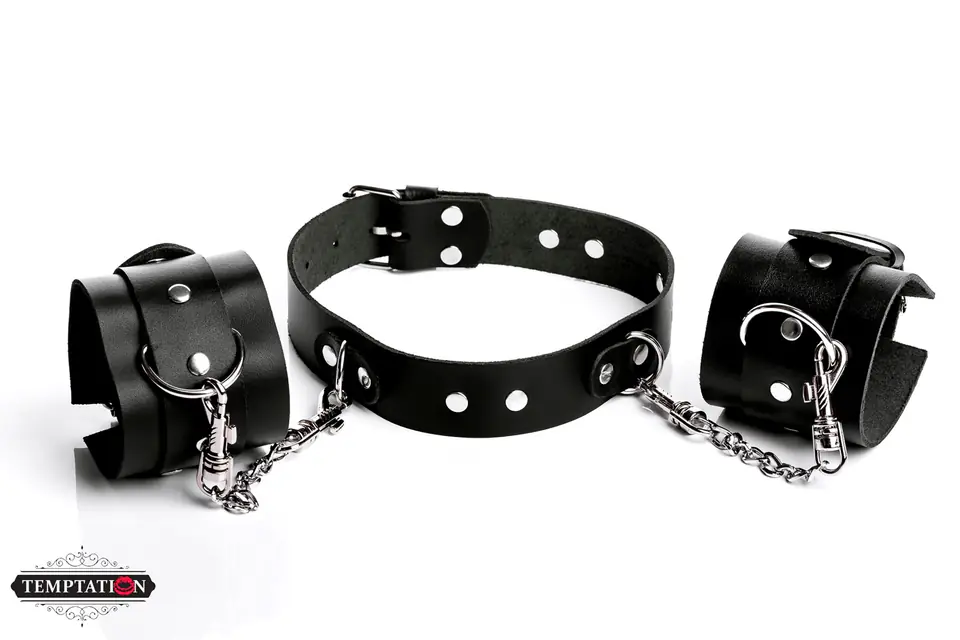 Obroża wąska połączona łańcuszkami z kajdankami na ręce Temptation