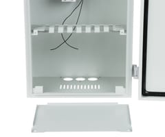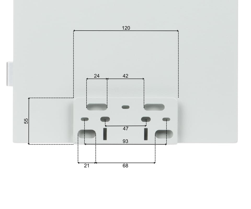 LN-BOX-DIN-IP65 to przemysłowa, wodoodporna skrzynia teletechniczna w klasie IP65, przeznaczona do montażu urządzeń na szynie DIN. Wewnątrz obudowy zamontowano szynę TH 35 (stal ocynkowana, grubość 1,1 mm), umożliwiającą szybkie i bezpieczne mocowanie np. switchy lub zasilaczy. Konstrukcja wykonana ze stali C45 z ocynkowaną powłoką gwarantuje trwałość. Dodatkowe elementy to dwutorowy wyłącznik nadprądowy B16, uchwyt na kable z przegrodą oraz system chłodzenia. Wymiary obudowy: 285 × 188 × 424 mm.