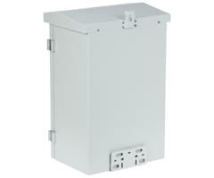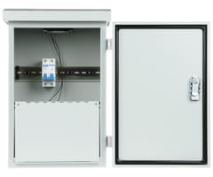 | Wybrane cechy: | Hermetyczna - Klasa szczelności : IP65 Gumowa uszczelka Szyna TH-35 Otwory na przewody od dołu : 3 x Ø 25 mm Dwutorowy wyłącznik nadprądowy B16 System chłodzenia powietrzem w górnej części obudowy Obudowa przystosowana do montażu na ścianie lub na słupie Drzwi zamykane są na zamek |