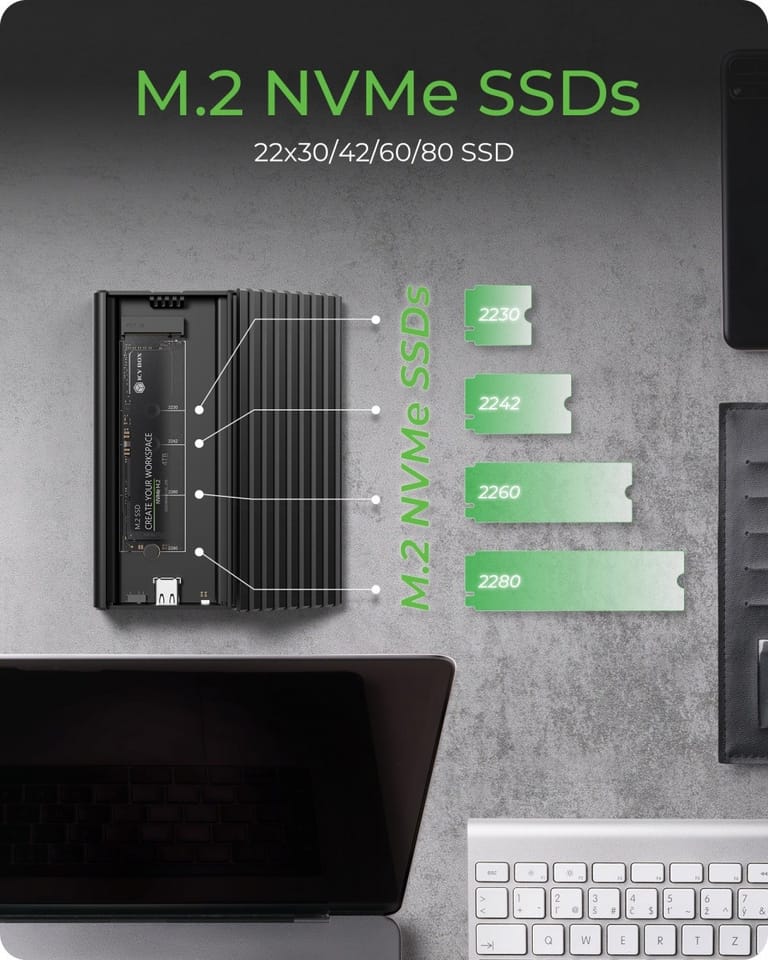 - Uniwersalna kompatybilność: w obudowie mieszczą się dyski SSD M.2 NVMe o długościach 30/42/60 lub 80 mm. Zapewnia to natychmiastowe usprawnienie pracy w smukłej obudowie