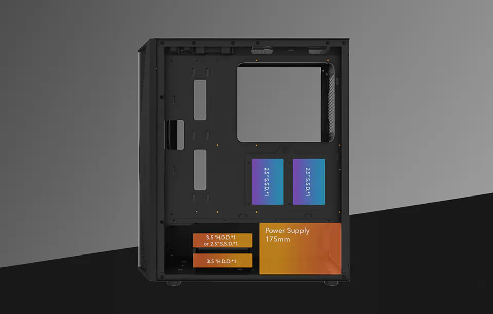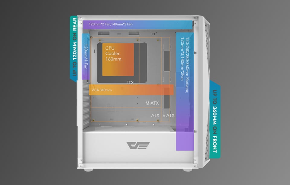 Złóż swój wymarzony komputer bez obawy o to, że nie wystarczy Ci miejsca na wybrane podzespoły. Obudowa Darkflash DK352 Plus oferuje pojemne wnętrze, które zapewnia możliwość wyposażenia jej w płytę główną w standardzie ATX / M-ATX / ITX / E-ATX czy kartę graficzną o długości 340 mm. Posiada również przezroczyste panele, które idealnie współgrają z komponentami opartymi o podświetlenie. W zestawie znajdziesz również 4 wentylatory Darkflash C6.