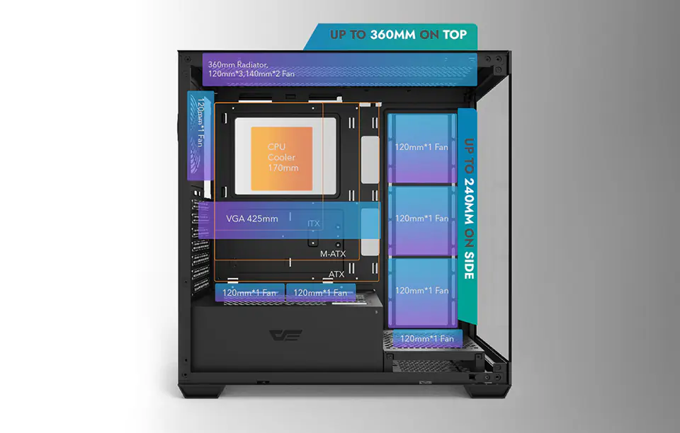 Darkflash DS900 to nowoczesne rozwiązanie dla wymagających użytkowników, ceniących zarówno estetykę, jak i funkcjonalność. Charakterystyczny, czarny design z panoramiczną konstrukcją bez słupka A, wyposażony w podwójne, w pełni przezroczyste ścianki ze szkła, nie tylko prezentuje się efektownie, ale także zapewnia doskonałą widoczność komponentów. Obudowa została stworzona z myślą o zapewnieniu optymalnego chłodzenia, wydajności i wszechstronności, jednocześnie oferując łatwość w modyfikacji i rozbudowie systemów komputerowych. Zestaw nie zawiera wentylatorów.
