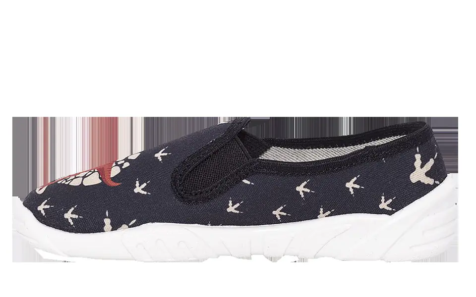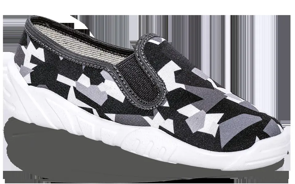 Obuwie chłopięce wsuwane. Tkanina wierzchnia drukowana a środek z tkanina bawełniana. Usztywniana piętka. Lekka elastyczna podeszwa z bezftalanowego PVC w białym kolorze. Wkładka wykonana z naturalnej skóry oraz elastycznej pianki. Pianka zawiera węgiel aktywny. Skóra absorbuje nadmiar wilgoci, a węgiel aktywny pochłania nieprzyjemne zapachy zapewniając stopie uczucie świeżości. Dane techniczne: - usztywniana piętka, - sórzana wkładka, - anatomiczne profilowanie, - oddychająca podeszwa, - elastyczna podeszwa, - wnętrze cholewki tkanina bawełniana, - materiał oddychający.