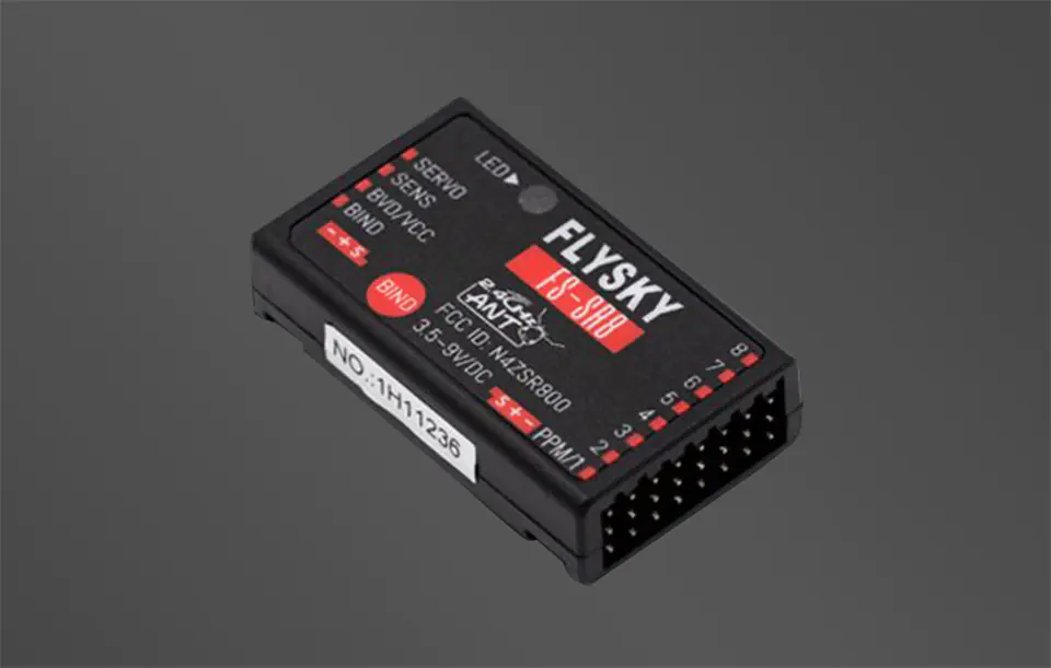 FS-SR8 jest 8-kanałowym odbiornikiem z podwójną anteną, który pracuje z częstotliwością wynoszącą 2.4 GHz. Wyróżnia się zasięgiem sięgającym nawet 1000 m na powierzchni. Jego wymiary wynoszą zaledwie 44.8 x 26.6 x 11.3 mm, a waga – jedynie 10 g. Zaprojektowany został dla nadajników FS-ST8, FS-4GP, FS-G7P i korzysta ze stabilnego protokołu ANT. Obsługuje wskaźnik mocy RSSI oraz sygnały wyjściowe PWM, PPM, i.BUS i s.BUS.