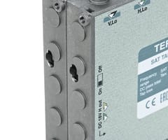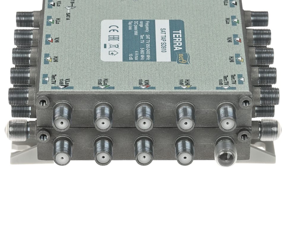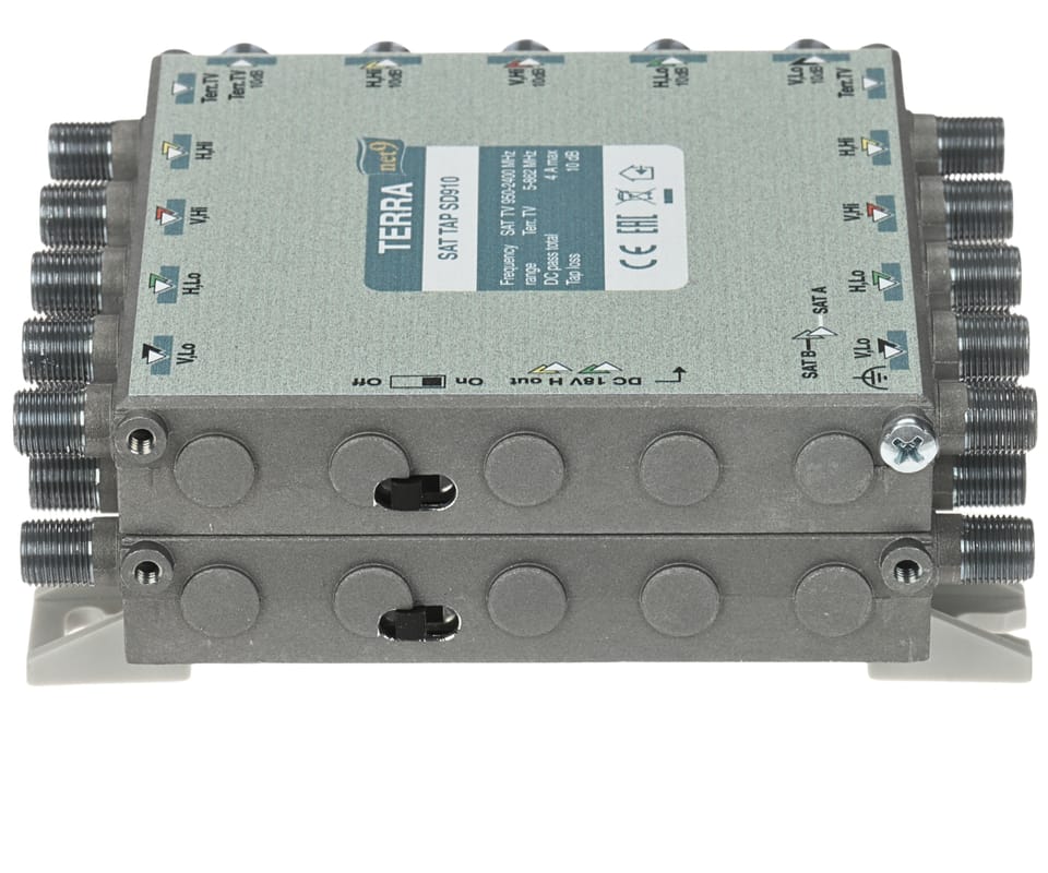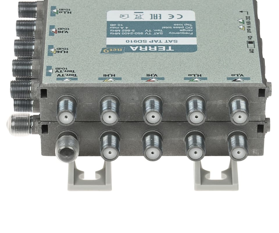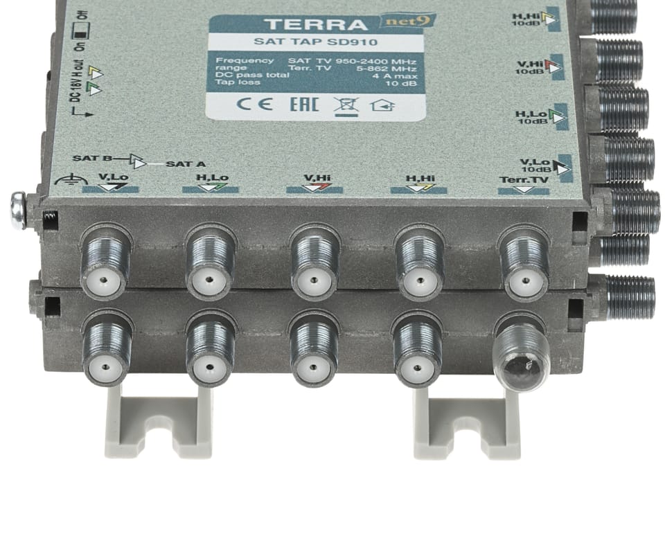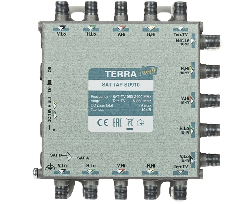 TERRA SD-910 to odgałęźnik RTV/SAT do instalacji multiswitchowych, służący do wydzielenia sygnału z magistrali na tor główny (przelot) oraz tor odgałęźny o większym tłumieniu. Urządzenie obsługuje 8 torów SAT + RTV naziemną (łącznie 9 wejść / 18 wyjść) i zastępuje 9 pojedynczych odgałęźników, ułatwiając wyrównanie poziomów sygnału w różnych częściach instalacji. Tłumienie w torze odgałęźnym wynosi 10 dB (RTV) oraz 8 ... 12 dB (SAT), a przełącznik umożliwia sterowanie przejściem DC. Odlewana obudowa zapewnia ekranowanie w klasie A.Rozgałęźnik posiada przełącznik przejścia stałoprądowego, który ustawiony w pozycję "ON" przepuszcza napięcie stałe przez tory "H" do obydwu gałęziUstawiony w pozycje \"OFF\" przepuszcza napięcie tylko do jednej gałęzi