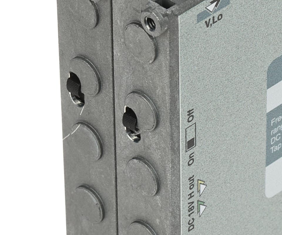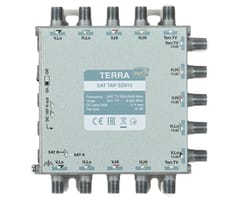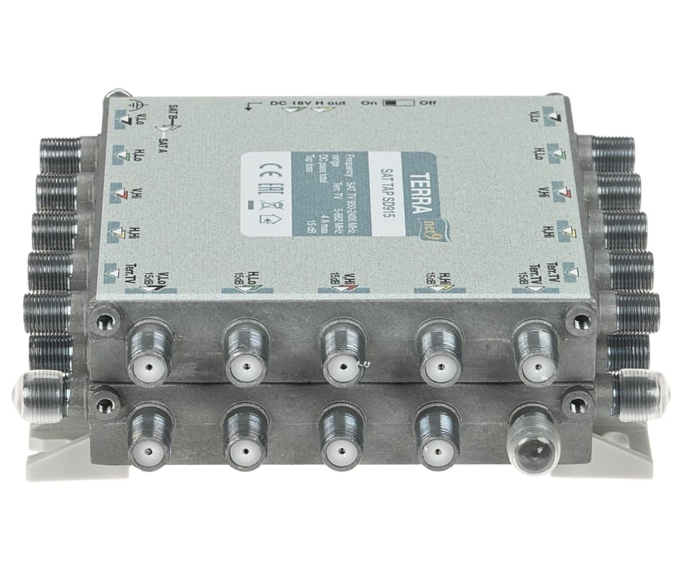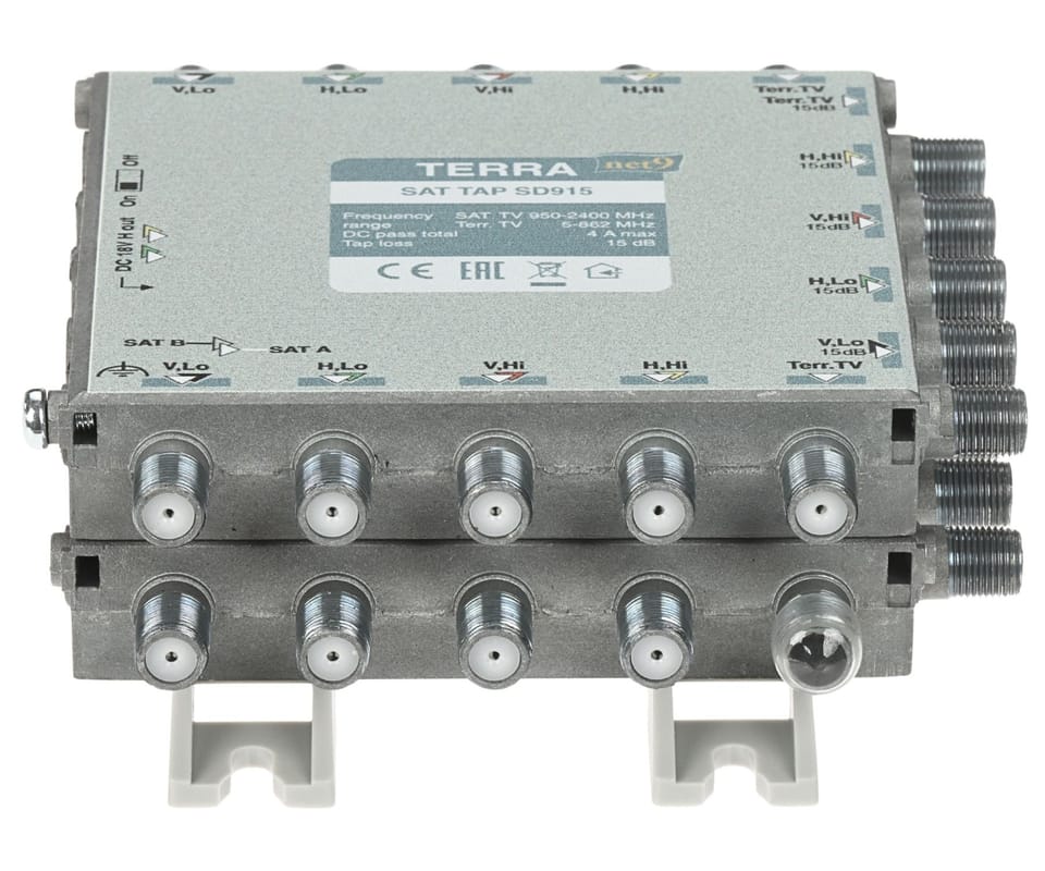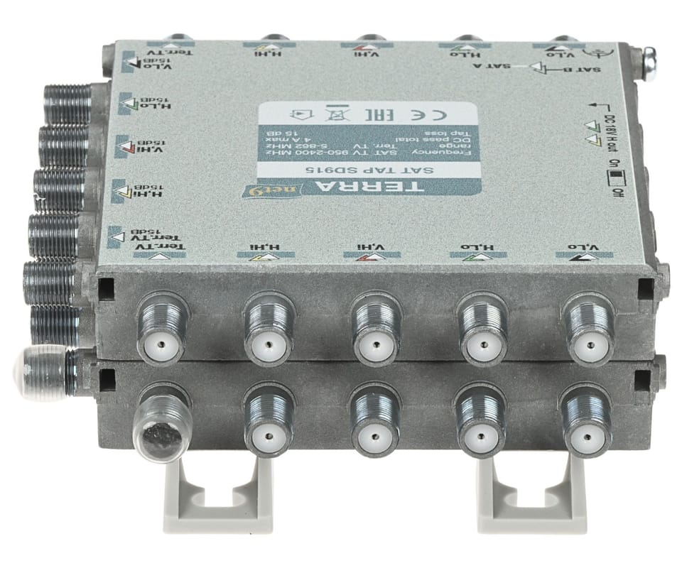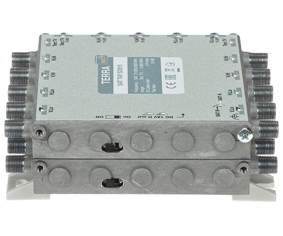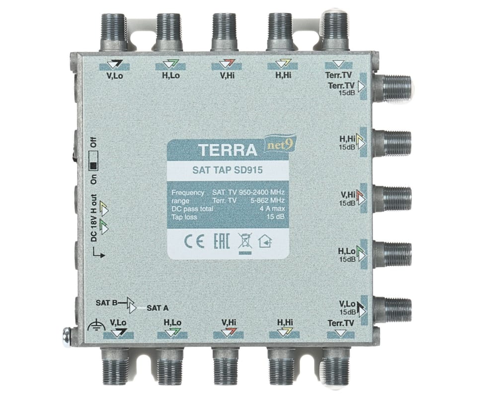 TERRA SD-915 to odgałęźnik RTV/SAT do instalacji multiswitchowych, służący do wydzielenia sygnału z magistrali na tor główny (przelot) oraz tor odgałęźny o większym tłumieniu. Urządzenie obsługuje 8 torów SAT + RTV naziemną (łącznie 9 wejść / 18 wyjść) i zastępuje 9 pojedynczych odgałęźników, ułatwiając wyrównanie poziomów sygnału w różnych częściach instalacji. Tłumienie w torze odgałęźnym wynosi 15 dB (RTV), a przełącznik umożliwia sterowanie przejściem DC; odlewana obudowa zapewnia ekranowanie w klasie A.Rozgałęźnik posiada przełącznik przejścia stałoprądowego, który ustawiony w pozycję "ON" przepuszcza napięcie stałe przez tory "H" do obydwu gałęziUstawiony w pozycje \"OFF\" przepuszcza napięcie tylko do jednej gałęzi