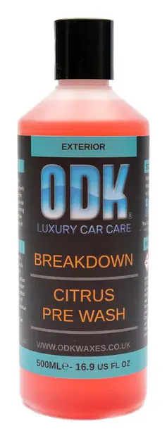 ODK Breakdown Citrus Pre Wash – całkowicie nowa formuła, całkowicie przerobiona, aby zapewnić dokładniejsze czyszczenie. Breakdown to produkt stworzony do mycia wstępnego na bazie cytrusów, które zapewnia mocniejsze i lepsze czyszczenie. Można rozcieńczać w opryskiwaczu z pompką lub za pomocą lancy do piany aktywnej.