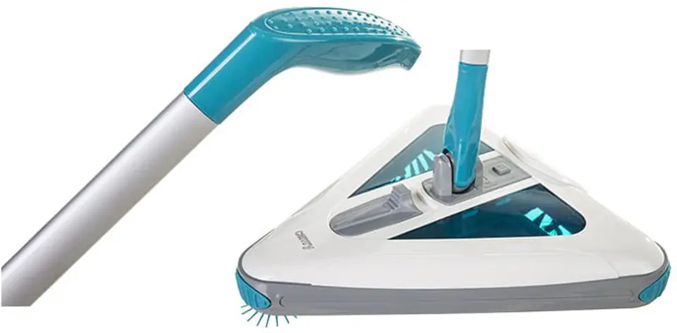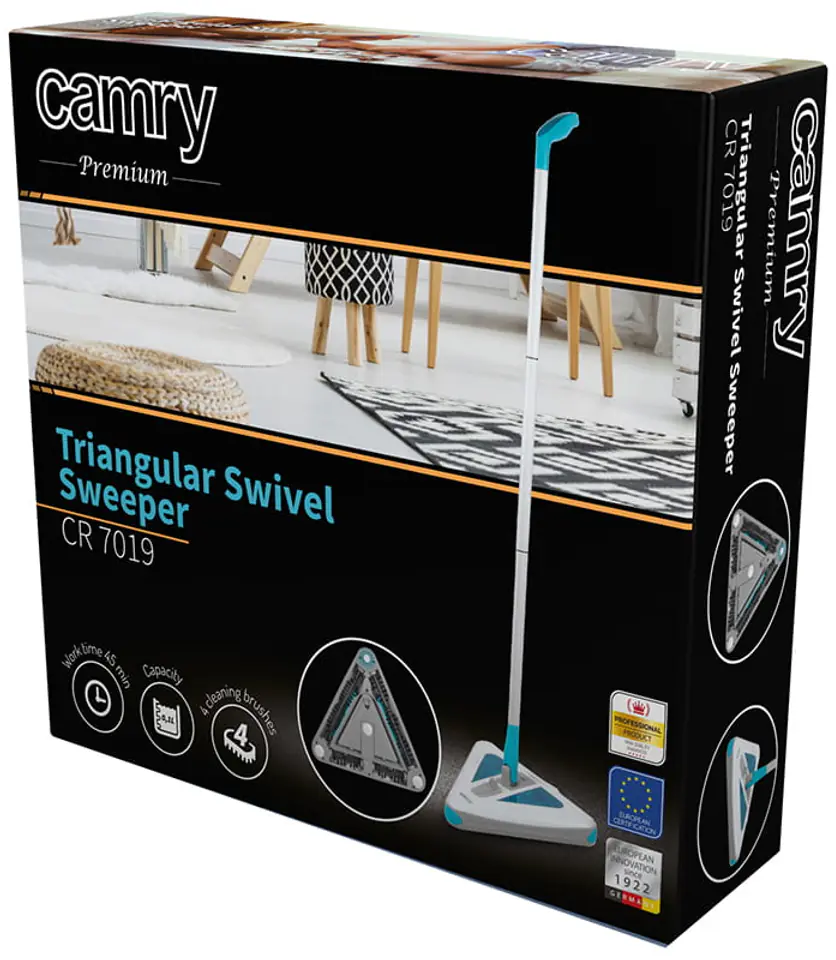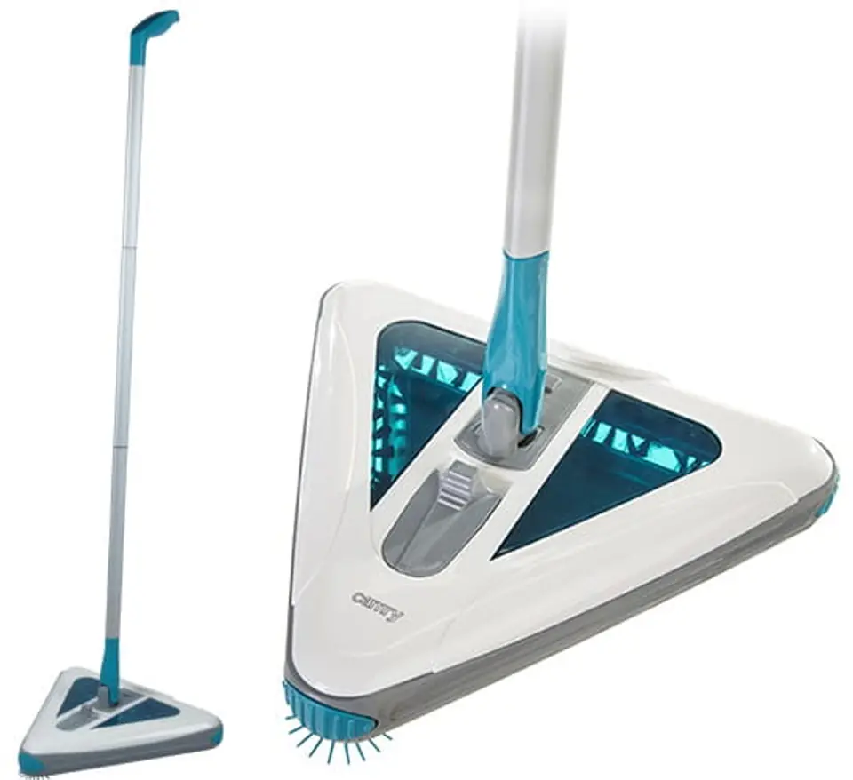 Odkurzacz Camry CR 7019 posiada tak pojemny akumulator, że po jednym naładowaniu wystarcza aż na 45 min odkurzania. Możemy go naładować przy pomocy dołączonego zasilacza. Urządzenie posiada trójkątną głowicę czyszczącą, która wyposażona jest w obrotowe, miękkie szczotki. Gumowe narożniki ochronią nasz meble przed otarciami. W dolnej części obudowy odkurzacza znajdują się trzy okrągłe ślizgacze, powodują one, że odkurzacz lekko ślizga się po każdej powierzchni. Wszystkie szczotki kierują kurz i drobne śmieci do wnętrza trójkątnego zbiornika. Pojemnik ten możemy otworzyć przesuwając duży suwak w górnej części obudowy. Przez dwa przezroczyste okienka możemy zajrzeć do wnętrza pojemnika na kurz. Prosty mechanizm opróżniania umożliwi nam szybkie i łatwe czyszczenie urządzenia. Duży i szeroki włącznik, znajduje się na głowicy, dzięki czemu wygodnie można uruchomić odkurzacz stopą.