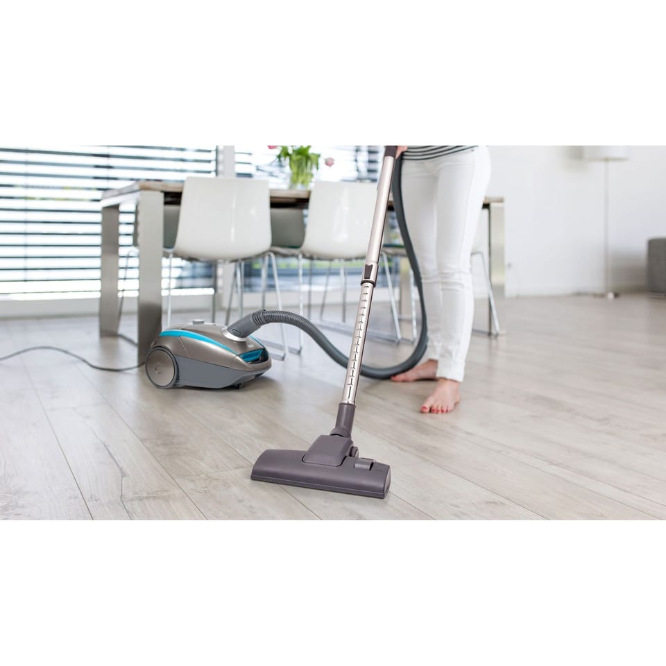 Dodatkowe końcówki, szczelinowa, duża dwustopniowa oraz mała z nakładką do parkietu to większy komfort pracy. A o zapełnieniu się worka poinformuje nas specjalny wskaźnik. Zastosowano w odkurzaczu filtr HEPA H13. Te filtry skutecznie unicestwiają kurz i bakterie znajdujące się w wydmuchiwanym powietrzu. Nie musisz się też martwić o swoją piękną podłogę, gumowe koła odkurzacza na pewno jej nie porysują.