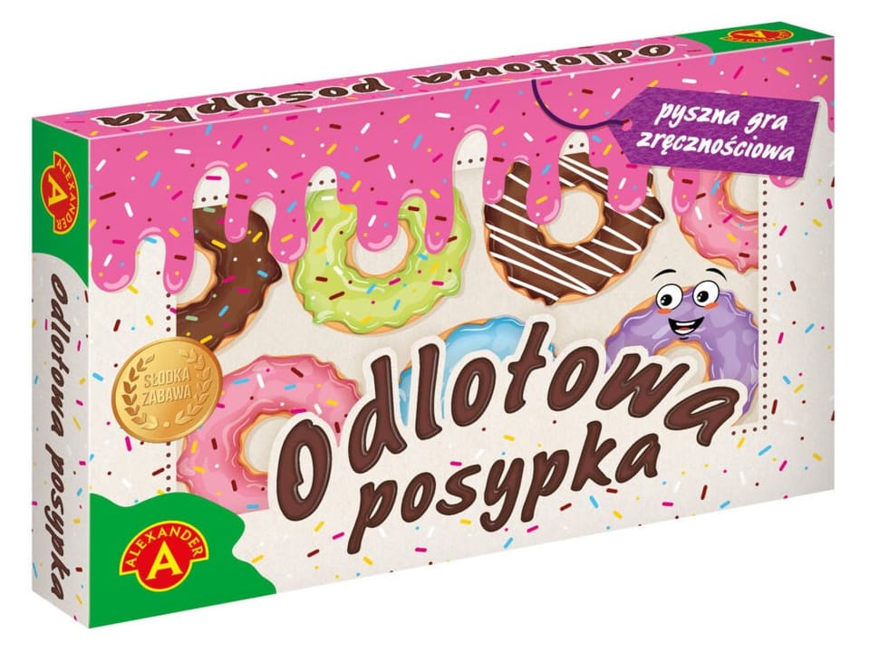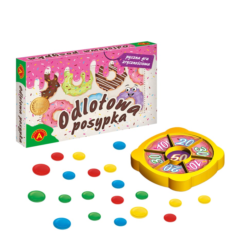ODLOTOWA POSYPKA pyszna gra zręcznościowa!ODLOTOWA POSYPKA to znana i lubiana gra zręcznościowa typu PCHEŁKI, ale w zupełnie nowej, słodkiej odsłonie. W pudełku znajduje się specjalna tarcza przypominająca smakowitego donut’a. Gracze ozdabiają go, strzelając w jego kierunku kolorową posypką („pchełkami”). W trakcie gry starają się trafić w najwyżej punktowane pola. Wygrywa ten, kto po wystrzeleniu całego zapasu posypki uzbiera największą ilość punktów. Oprócz pysznej zabawy, ODLOTOWA POSYPKA stanowi doskonały trening zręczności, precyzji i cierpliwości.Skuś się i zagraj!• Miseczka• Pchełki duże- 4 szt. • Pchełki małe - 16 szt. • Instrukcja