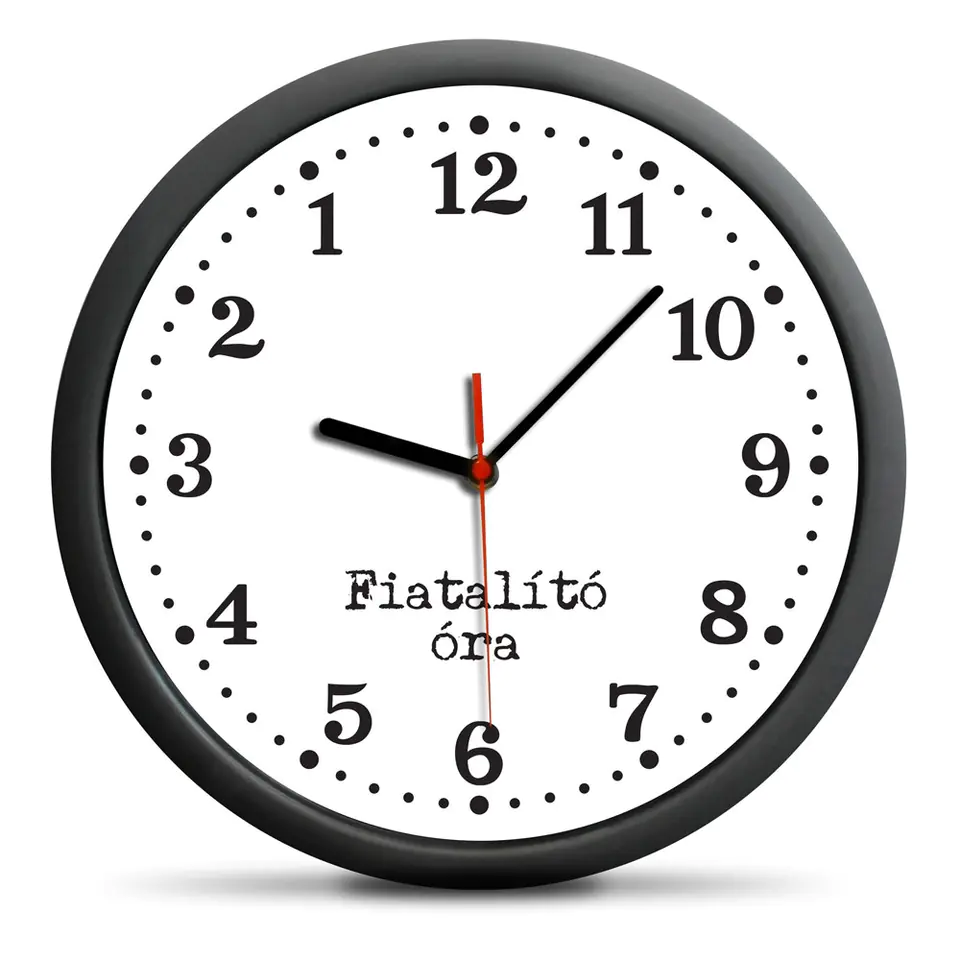 - Cofający mechanizm zegara – pozornie odmierza czas do tyłu. Cyfry na tarczy przedstawione są w lustrzanym odbiciu. Wskazówki poruszają się w odwrotnym kierunku niż w standardowym zegarze. Napis na produkcie: Fiatalító óra. Produkt w węgierskiej wersji językowej. Materiał: ABS pokryty gumowaną powłoką, szklana szybka. Wymiary: 30 cm (średnica). OSTRZEŻENIA:Baterie
