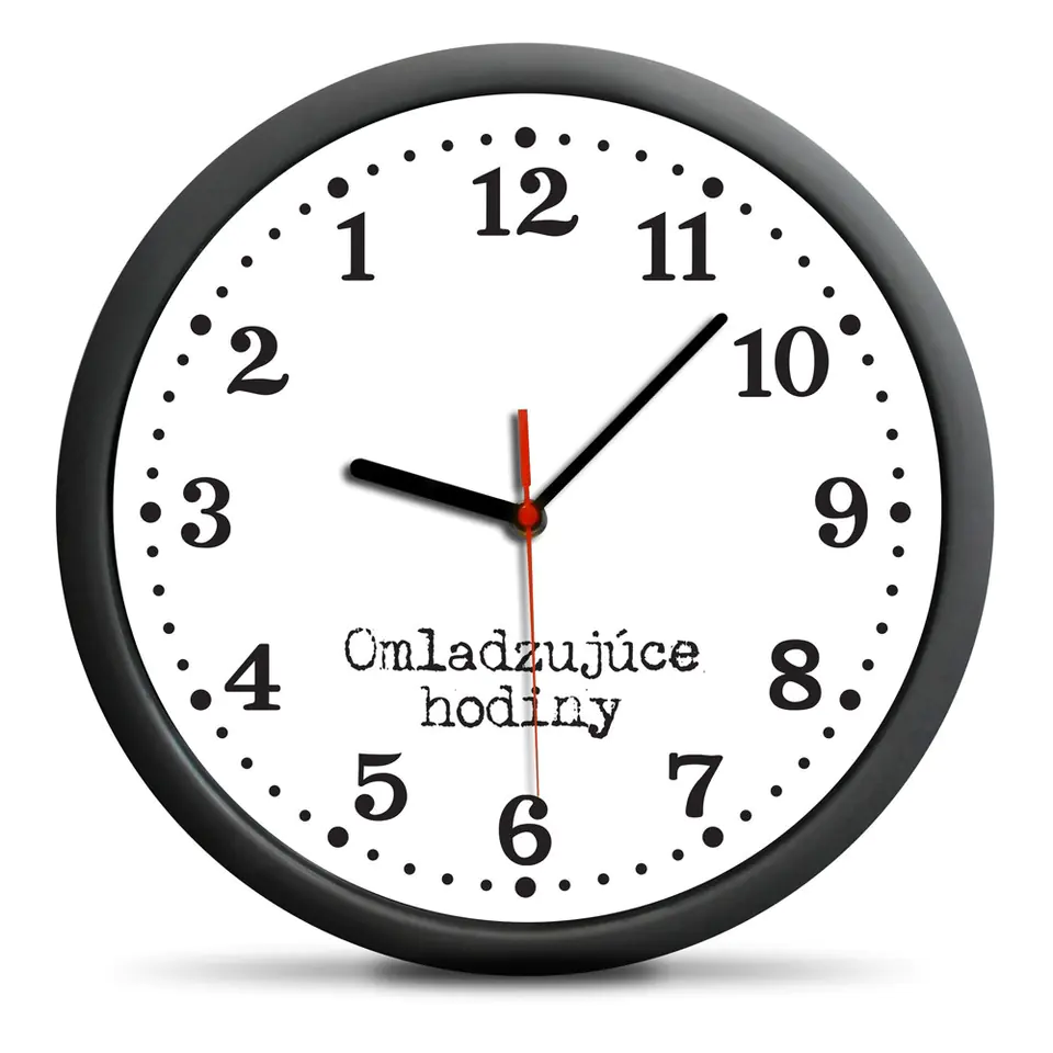 - Cofający mechanizm zegara – pozornie odmierza czas do tyłu. Cyfry na tarczy przedstawione są w lustrzanym odbiciu. Wskazówki poruszają się w odwrotnym kierunku niż w standardowym zegarze. Napis na produkcie: Omladzujúce hodiny. Produkt w słowackiej wersji językowej. Materiał: ABS pokryty gumowaną powłoką, szklana szybka. Wymiary: 30 cm (średnica). OSTRZEŻENIA:Baterie
