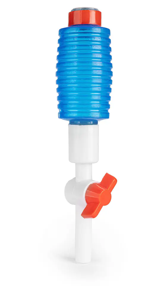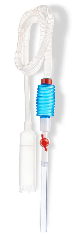 Odmulacz akwariowy z pompką i zaworkiem Odmulacz składa się z rurki wykonanej z transparentnego tworzywa sztucznego, długiego karbowanego wężyka, pompki, oraz specjalnej końcówki z sitkiem uniemożliwiającą zassanie żwiru wraz z zasysaną wodą. Po zassaniu z wypływającą wodą usunięte zostaną odchody ryb, fragmenty liści roślin, resztki pokarmu, muł i inne zanieczyszczenia gromadzące się w podłożu. Ponadto wylot węża odmulacza wyposażony jest w zawór odcinający za pomocą którego jednym ruchem możemy zakręcić wodę. Możemy dokładnie wyczyścić dno nie obawiając się że w zbiorniku spuścimy całą wodę. Urządzenie jest przy tym całkowicie bezpieczne dla ryb. Długość węża: 1,5m