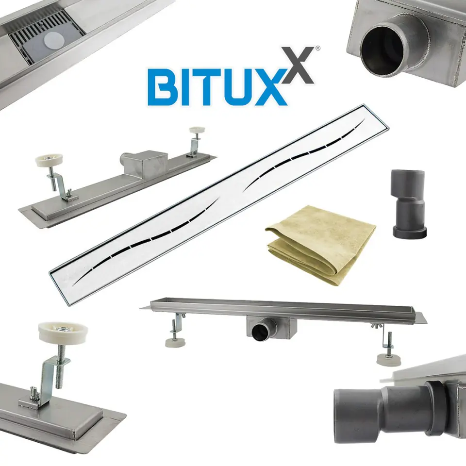ODPŁYW LINIOWY PRYSZNICOWY 50CMOdpływ liniowy Bituxx to wydajny i długotrwały spływ uniwersalny, którego można wykorzystać np. do łazienek, basenów, na taras, balkon, do pralni/kotłowni. Jest to odpływ podłogowy, którego zaletą jest możliwość dopasowania rozmiaru odpływu do rozmiaru płytki,brak konieczności ingerencji w ścianę,wysoka wytrzymałość na nacisk. Szeroki wybór dostępnych rozmiarów i wzorów umożliwia optymalne dopasowanie jego długości do wymiarów kabiny lub płytek i pozwala z większą swobodą, niż w przypadku tradycyjnych brodzików, planować miejsce prysznica.Cechy Produktu:- małe ryzyko rozszczelnienia- duża wydajność- niski syfon- mata wodoszczelna w zestawie- bezawaryjnyDane Techniczne:- Wydajność odpływu: 35l/min- Rura spustowa: DN40- Redukcja: fi40 na fi50- Wysokość bez nóżek 7,5cm- Maks. wysokość z nóżkami: 14,5cm- Długość: 50cm- Szerokość: 7cmW Zestawie:- korytko odprowadzające wodę z syfonem- maskownica- wyjmowany osadnik na zanieczyszczenia- wyjmowana kratka ochronna- regulowane nóżki z możliwością zdemontowania- mata uszczelniająca- kołnierz z wodoszczelnej tkaniny - uchwyt ułatwiający zdejmowanie maskownicy- instrukcja montażu