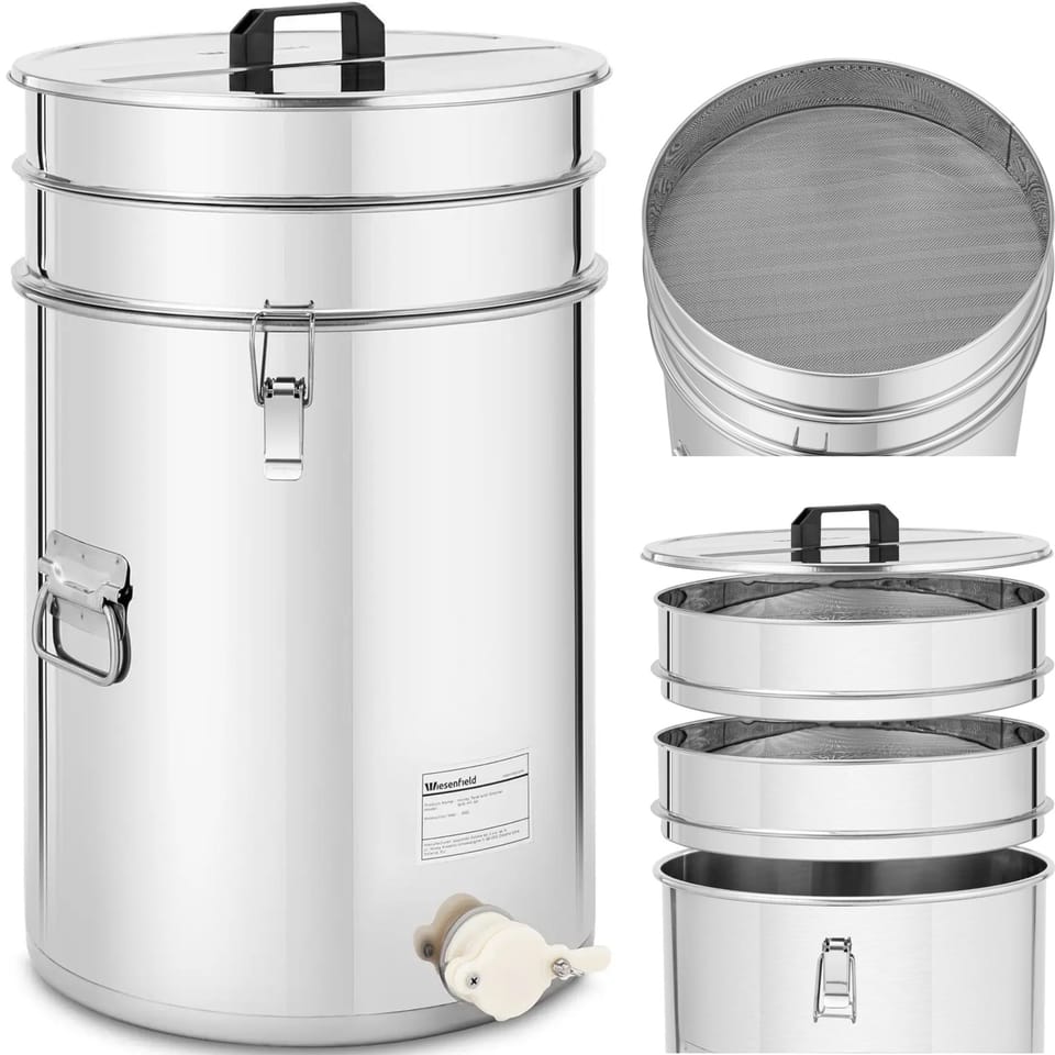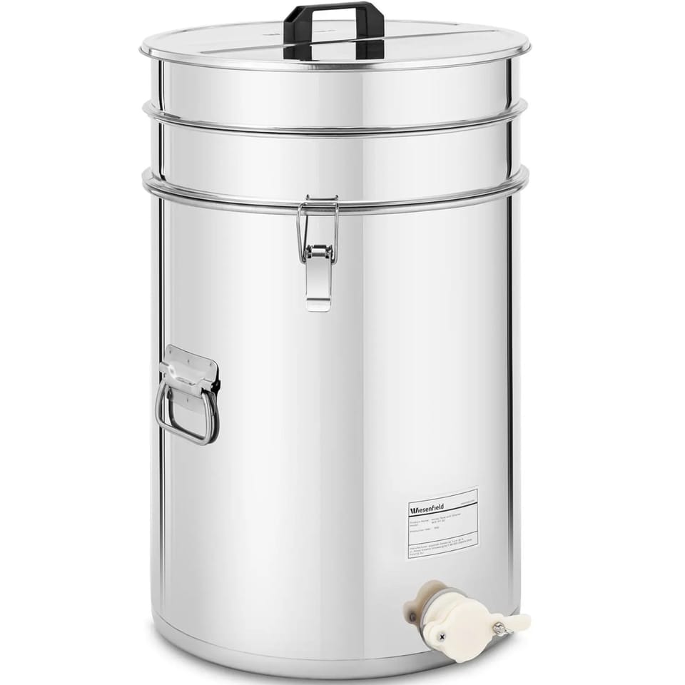 Kod producenta: 10280200Odstojnik na miód firmy Wiesenfield pozwoli przechować miód przez miesiące, a nawet lata w odpowiednich warunkach. Wyposażony w sitko, pokrywkę oraz zawór pozwala na bezpieczne przechowywanie miodu, a także wygodne przelewanie go w razie potrzeby. Wiaderko na miód jest zatem niezbędnym akcesorium zarówno dla pszczelarzy komercyjnych, jak i entuzjastycznych hobbystów. Praktyczny pojemnik ułatwia przetwarzanie miodu i jego przechowywanie dzięki dużemu otworowi i dołączonemu sitku. Pojemność 50 l pozwoli higienicznie zmagazynować duże ilości miodu przez długi czas. Wszystko za sprawą szczelnie przylegającej pokrywki, która idealnie dopasowuje się do odstojnika. Wiaderko posiada praktyczny zawór, za pomocą którego precyzyjnie można ustawić natężenie przepływu i uniknąć kapania. Wykonany ze stali nierdzewnej odstojnik jest łatwy do czyszczenia po użyciu. Dzięki wytrzymałemu materiałowi i wysokiej jakości wykonania pojemnik jest również wyjątkowo trwały. Dwa uchwyty ułatwiają przenoszenie całości.Cechy produktu:
