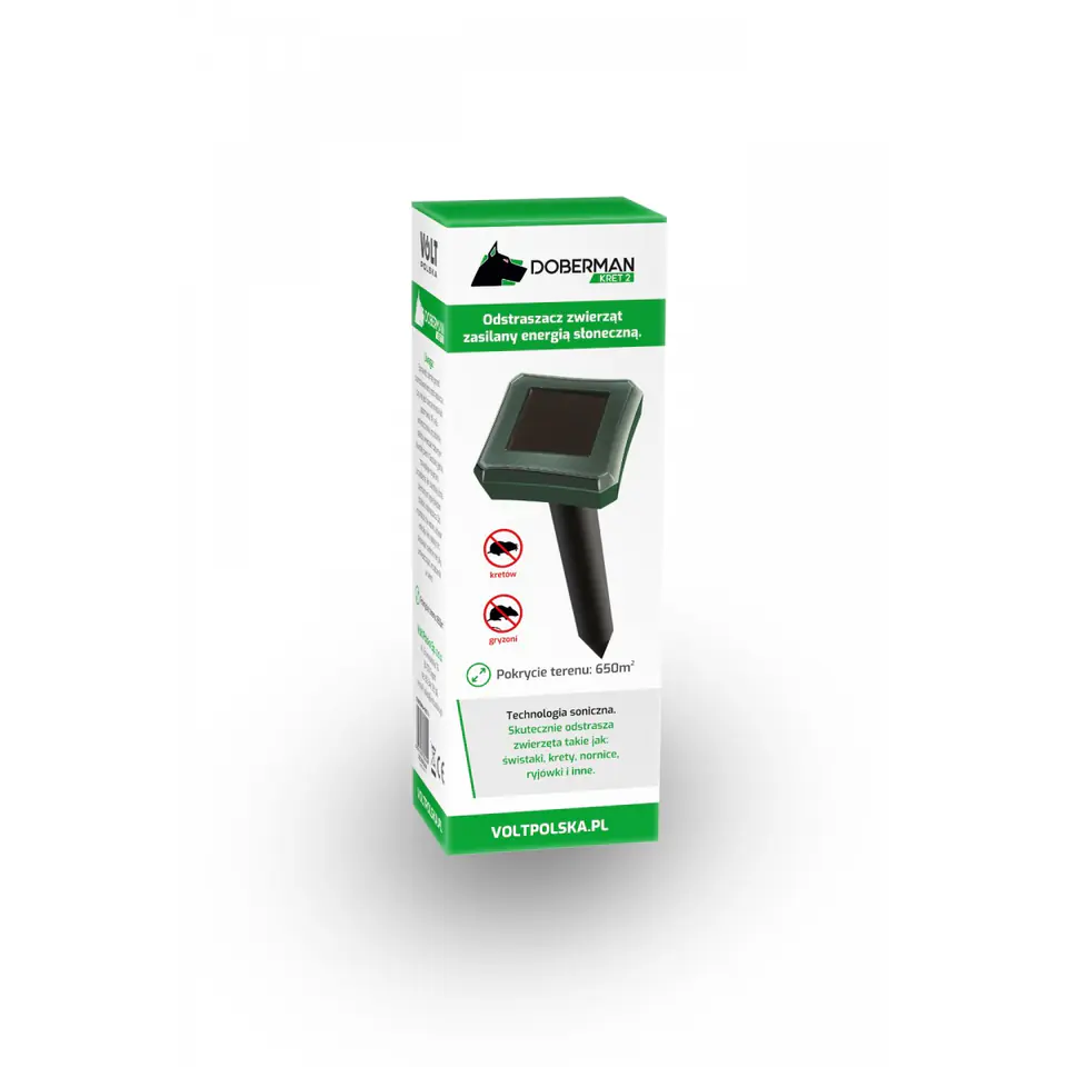 Odstraszacz kretów DOBERMAN KRET II to nowoczesne urządzenie do odstraszania zwierząt. Emituje fale dźwiękowe, które skutecznie odstraszają podziemne gryzonie i gady. Na początku sygnał trwa 2,7 sekundy, później następuje przerwa na 33,2 sekundy. Cykl się powtarza. W celu efektywnego wykorzystania odstraszacza, zaleca się instalację 2 urządzeń co 30 metrów. Produkt zasilany jest przez panel solarny. Naładowana bateria zapewnia pracę przez całą dobę. Na jakie zwierzęta działa odstraszacz kretów DOBERMAN KRET II?1.Gryzonie, gady Montaż i warunki użytkowania: 1.Podłącz dwa złącza znajdujące się wewnątrz plastikowej rurki do złączy na korpusie i upewnij się że kolor złączy jest zgodny.2.Zamocuj razem plastikową rurkę i główny korpus.3.Włóż plastikową rurkę do ziemi, uważaj aby nie użyć zbyt wielkiej siły, by nie uszkodzić urządzenia, lub nie natrafić na przeszkody. Podstawa głównego korpusu powinna być wystawiona na zewnątrz około 1cm nad ziemią.