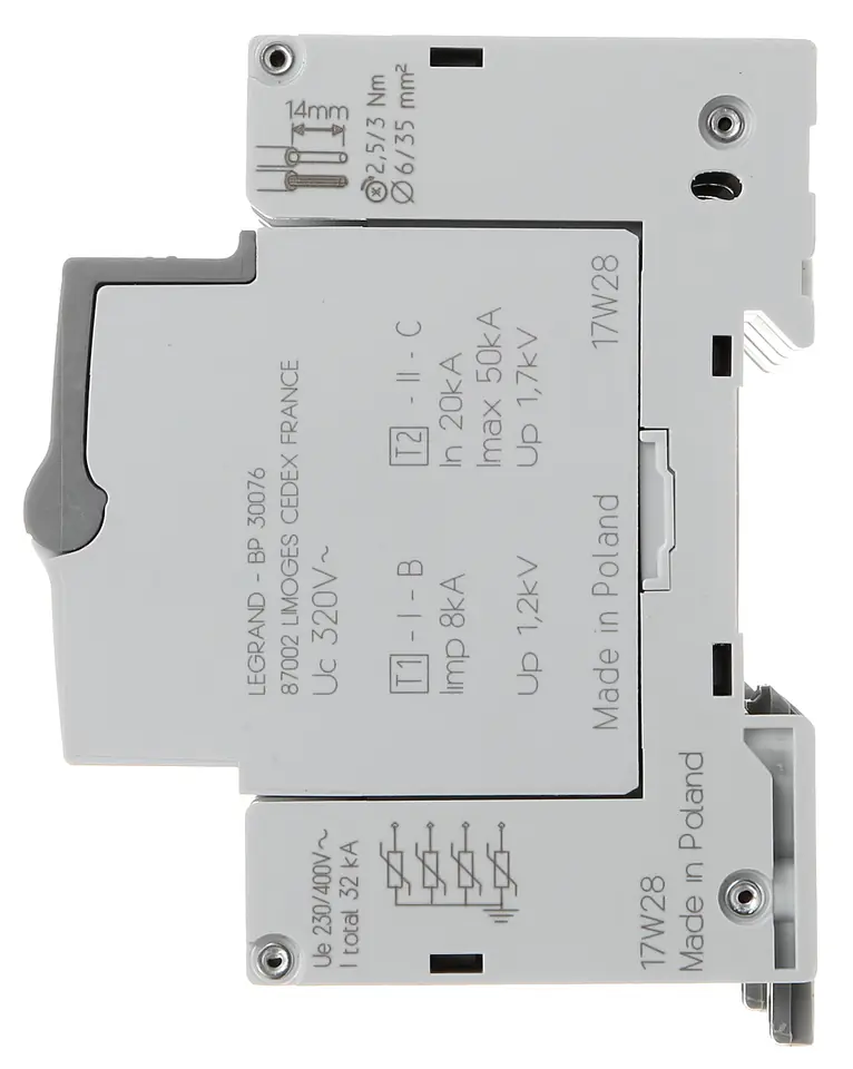 Urządzenie zabezpieczające, chroni urządzenia przed skutkami wyładowań atmosferycznych lub przepięciami pochodzącymi od sieci AC 230VUrządzenie LE-412253 przewidziane jest do montażu na szynie DIN TS-35