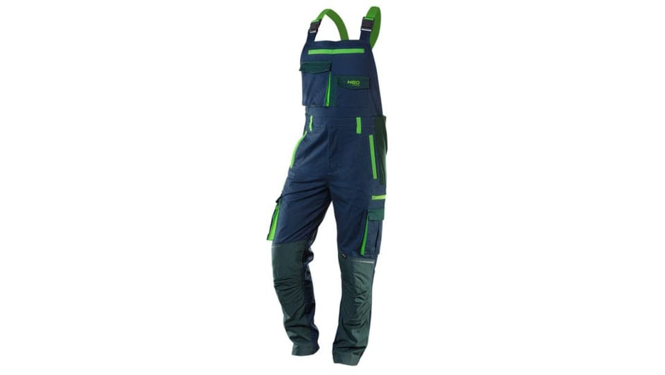 Ogrodniczki robocze PREMIUM, materiał główny 62% bawełna, 35% poliester, 3% elastan, gramatura 270 g/m2; dzianian ribowa 92% bawełna, 8% elastan, gramatura 360 g/m2, wzmocnienia Cordura, materiał z dodatkiem elastanu zwiększa komfort pracy, elastyczne panele po bokach zapewniają lepsze dopasowanie do sylwetki, wzmocnienie z Cordury na kolanach i piszczelach wraz z miękkim wypełnieniem zaszytym wewnątrz, wielofunkcyjne, pojemne kieszenie, profilowane kolana, odblaskowe nadruki oraz odblaskowy element na plecach, wewnętrzna wszywka imienna, unikalny projekt własny, Certyfikat CE, rozmiar L