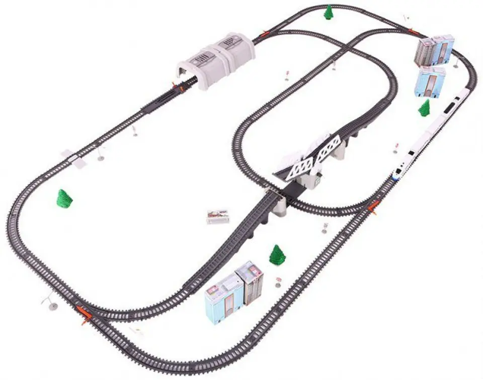 - tory z rozjazdami (+914 cm), - lokomotywa z regulacją prędkości, - 4 wagony osobowe, - 2 duże tunele, - ruchomy most, - akcesoria dekoracyjne: drzewka, budynki, znaki - kolorowe opakowanie, idealnie nadające się na prezent.