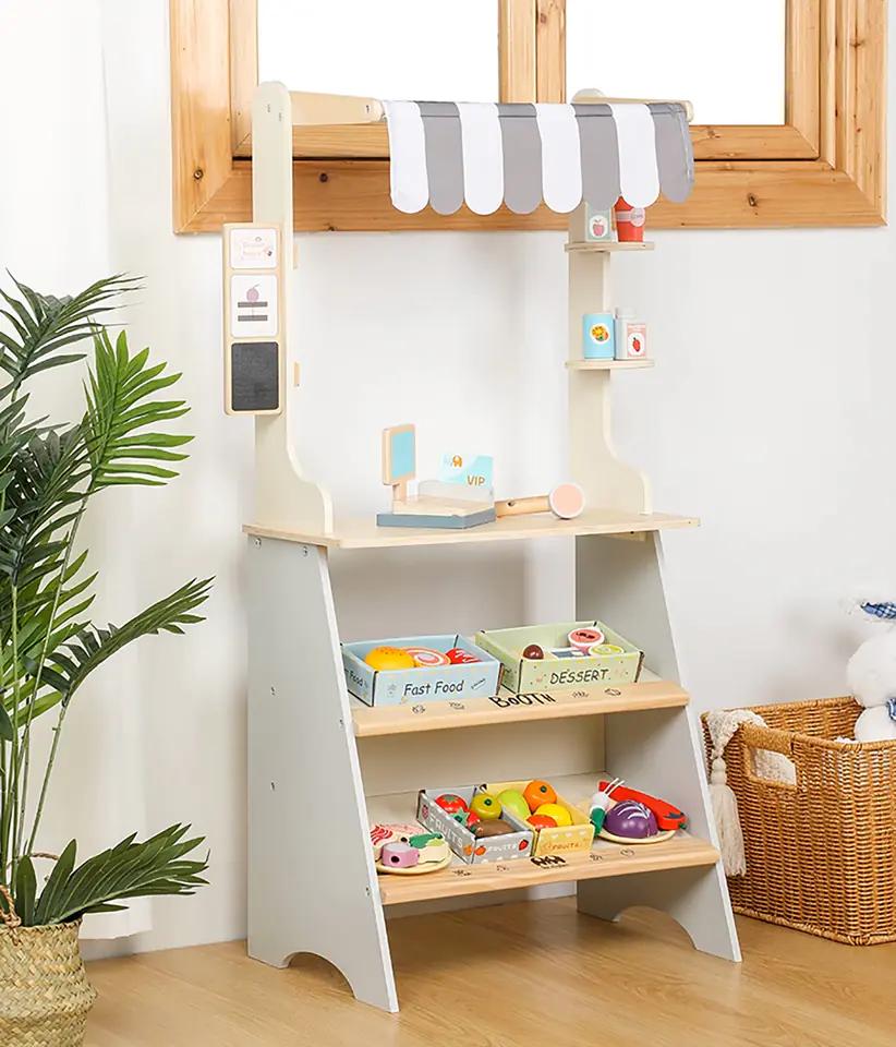 Które dziecko nie lubi wcielać się w rolę kierownika sklepu? Nasz nowy sklep jest pięknie pomalowany na żywe kolory, posiada sklepowe półki, ladę, stragan na warzywa i owoce.