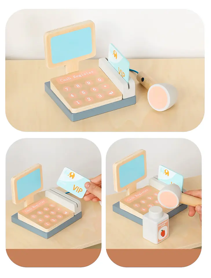 - drewnianą kasę z czytnikiem i kartą płatniczą