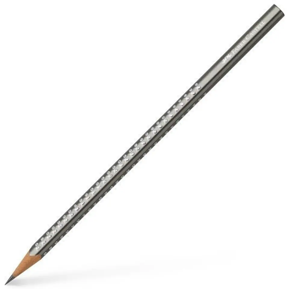 Ołówek grafitowy Jumbo Sparkle Faber-Castell w kolorze Metallic Violet (fioletowy metaliczny). Unikalny design z atrakcyjnymi błyszczącymi kropkami został zaprojektowany tak, aby dodać blasku biurkowej codzienności. Ołówek posiada brokatową końcówkę. Ergonomiczny trójkątny kształt zapewnia wysoki komfort użytkowania i niemęczące, wygodne pisanie i szkicowanie. Większy rozmiar – doskonały do nauki pisania. Odpowiedni również dla leworęcznych.