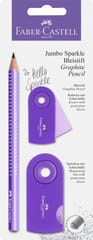 Ołówek JUMBO SPARKLE SLEEVE + temperówka + gumka fiolet blister 11675 Faber-Castell Zestaw z ołówkiem grafitowym Jumbo Sparkle Faber-Castell w kolorze perłowym fioletowym z gumką Sleeve i temperówką Sleeve. Unikalny design z atrakcyjnymi błyszczącymi kropkami został zaprojektowany tak, aby dodać blasku biurkowej codzienności. Ołówek posiada brokatową końcówkę. Ergonomiczny trójkątny kształt zapewnia wysoki komfort użytkowania i niemęczące, wygodne pisanie i szkicowanie. Większy rozmiar – doskonały do nauki pisania. Odpowiedni również dla leworęcznych. Z odpornym na pękanie grafitem o stopniu twardości HB, dzięki bezpiecznemu procesowi wiązania (SV). Wykonany z certyfikowanego drewna pochodzącego ze zrównoważonego i odpowiedzialnie zarządzanego leśnictwa. Powierzchnia pokryta lakierem na bazie wody – bezpiecznym dla środowiska i zdrowia dzieci. Gumka bez zawartości PVC.