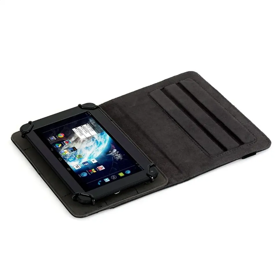 MARYLAND to seria etui na tablety o przekątnych 7”, 8” i 9.7” wyposażona w FUNKCJĘ STAND, która pozwala ustawić tablet w pozycji stojącej. Sprzęt ustawiony w ten sposób umożliwia wygodne oglądanie filmów i zdjęć. W MARYLAND dodatkowe bezpieczeństwo gwarantują mocowania w postaci czterech klamerek w rogach etui, wykonanych z twardego tworzywa i stabilizowanych przez wszyte w podstawę gumki. Ich elastyczność sprawia, że urządzenie pozostaje zawsze na swoim miejscu i zapobiega zniszczeniu któregokolwiek z brzegów obudowy. Takie rozwiązanie pozwala także na szybkie umieszczenie lub wyciągnięcie urządzenia z etui, którego wnętrze wyścielone jest miękkim i przyjemnym w dotyku welurem. Zewnętrzny materiał o strukturze plastrów miodu nadaje serii MARYLAND nowoczesnego wyglądu dostępnego w trzech wersjach kolorystycznych: czarnym, brązowym i szarym. Cechy produktu: Kolor: czarny Wymiary zewnętrzne: 14,5 x 20,5 x 2,5 mm Wymiary wewnętrzne: 13 x 19,7 x 0,7 mm Pojemność 7" Produkt jest przeznaczony do większości tabletów 7" dostępnych na rynku europejskim (Samsung Galaxy Tab , mini iPad, Kindle Fire, Blackberry Playbook, Dell Streak, Google Nexus, Omega MID7002 / MID7003 / MID7004 / MID7005; Coby) Maksymalny rozmiar urządzenia: 203x135x12mm Materiał: PU, z antypoślizgową powierzchnią.