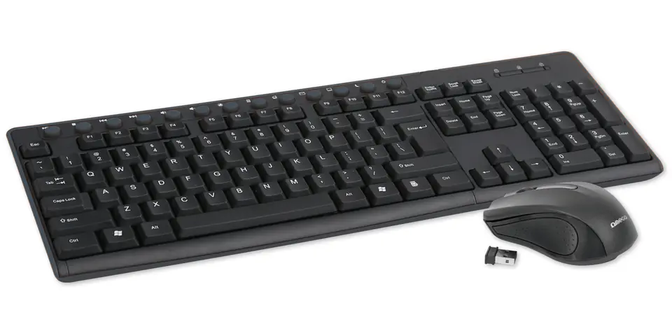 Zestaw OKM071B składa się z bezprzewodowej klawiatury o niskim skoku klawiszy oraz bezprzewodowej myszki optycznej 1000 DPI.
