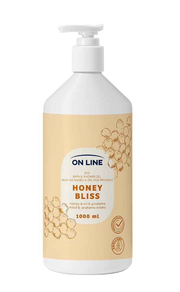 On Line Honey bliss delikatny płyn do kąpieli & żel pod prysznic 2w1 wzbogacony gliceryną, witaminą E, proteinami mleka, ekstraktem z miodu oraz emolientem pochodzącym z masła murumuru.