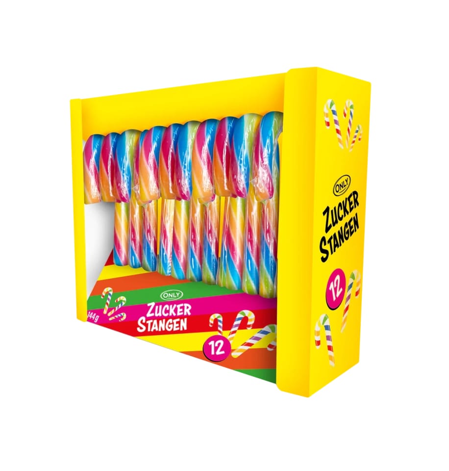 Candy Canes Rainbow to klasyczne, twarde karmelki w świątecznym stylu, które zachwycają intensywnym smakiem truskawki. Dzięki charakterystycznemu kształtowi laski i żywym kolorom tęczy, te słodycze doskonale sprawdzą się jako ozdoba choinki lub słodki dodatek do prezentów.