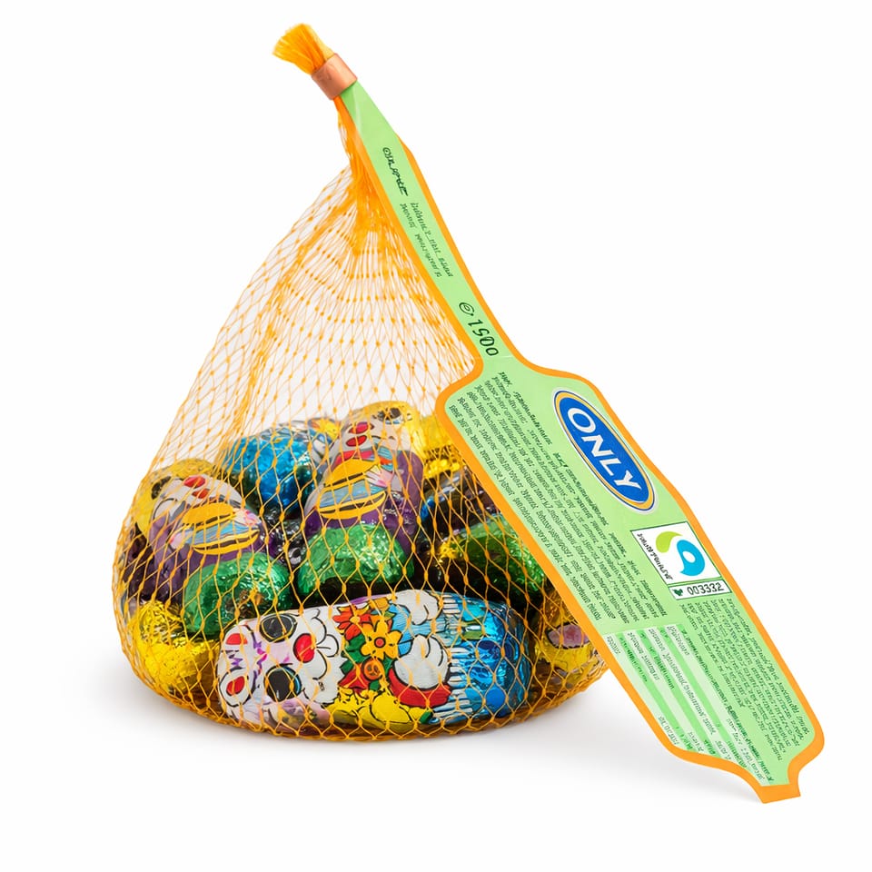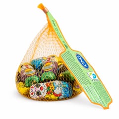 Kolorowe opakowanie w formie siatki z figurkami zajączków sprawia, że produkt świetnie prezentuje się w koszyczku wielkanocnym, jako słodka dekoracja stołu, drobny prezent lub element świątecznego zestawu prezentowego.