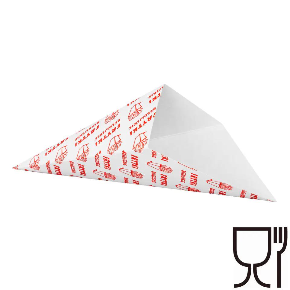 Opakowanie na frytki typu rożek wykonane z litej, bielonej tektury o gramaturze 250 G/m2. Posiada atest dopuszczający do kontaktu z żywnością. Rodzaj użytej tektury zapewnia optymalną sztywność rożka do frytek belgijskich, oraz ogranicza przedostawanie się tłuszczu.